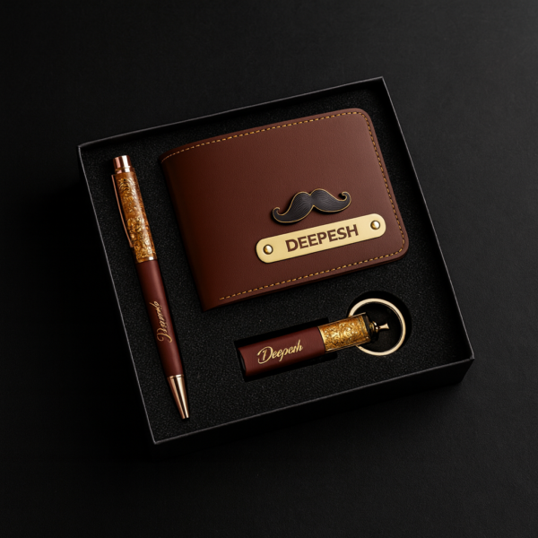 Discover the perfect blend of luxury and personalisation with our Gold Flakes Wallet Combo, available in four elegant colour options. This premium gift set includes a customised wallet, a gold-flake luxury pen, and a personalised keychain, all beautifully arranged in a high-quality gift box.