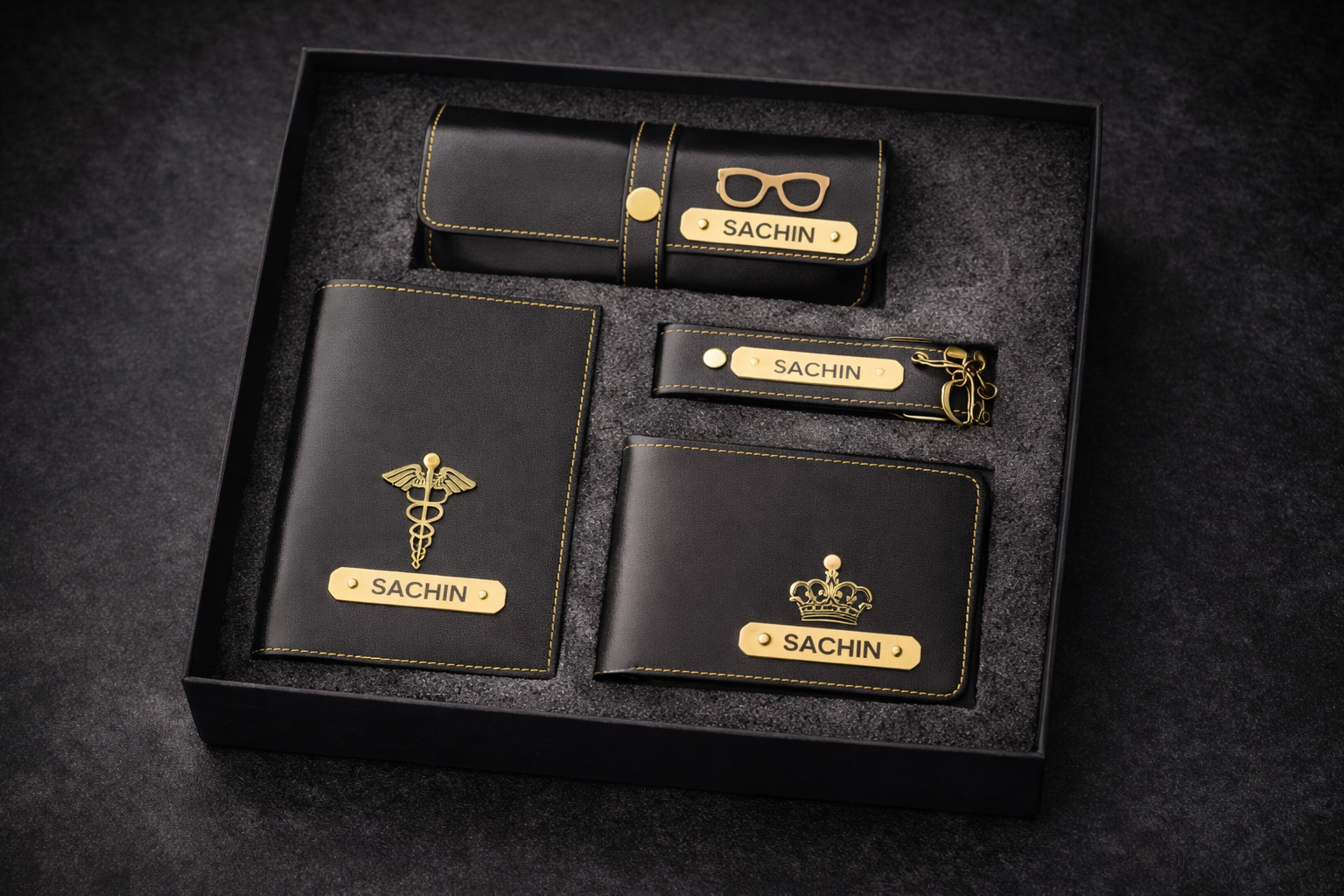 This luxury combo includes a stylish wallet, passport/utility cover, keychain, and a matching leather pouch, all neatly arranged in a premium gift box with protective foam packaging. The minimalist black-and-gold theme gives the set a timeless, professional appeal—ideal for executives, doctors, entrepreneurs, and anyone who appreciates refined accessories.